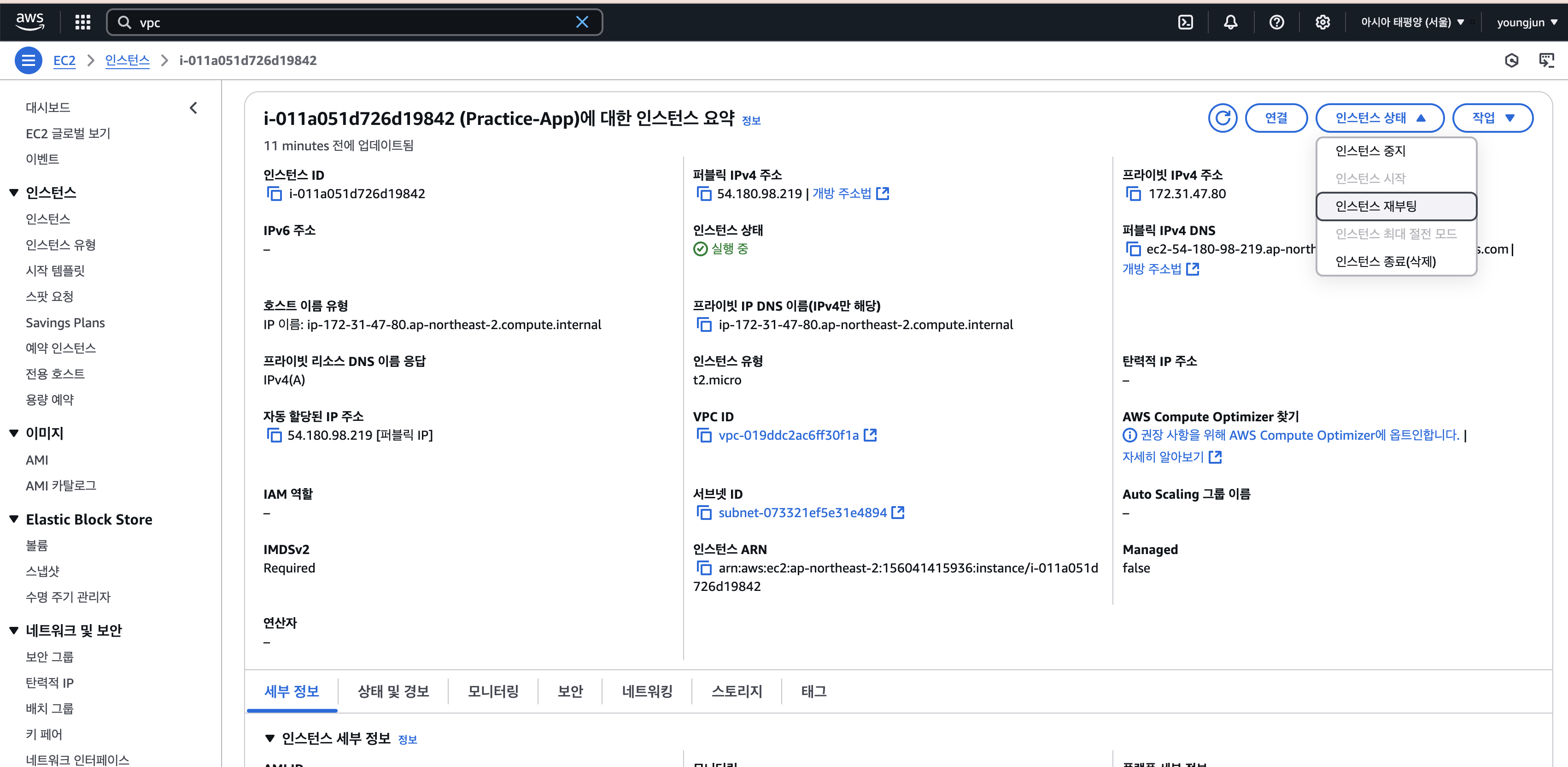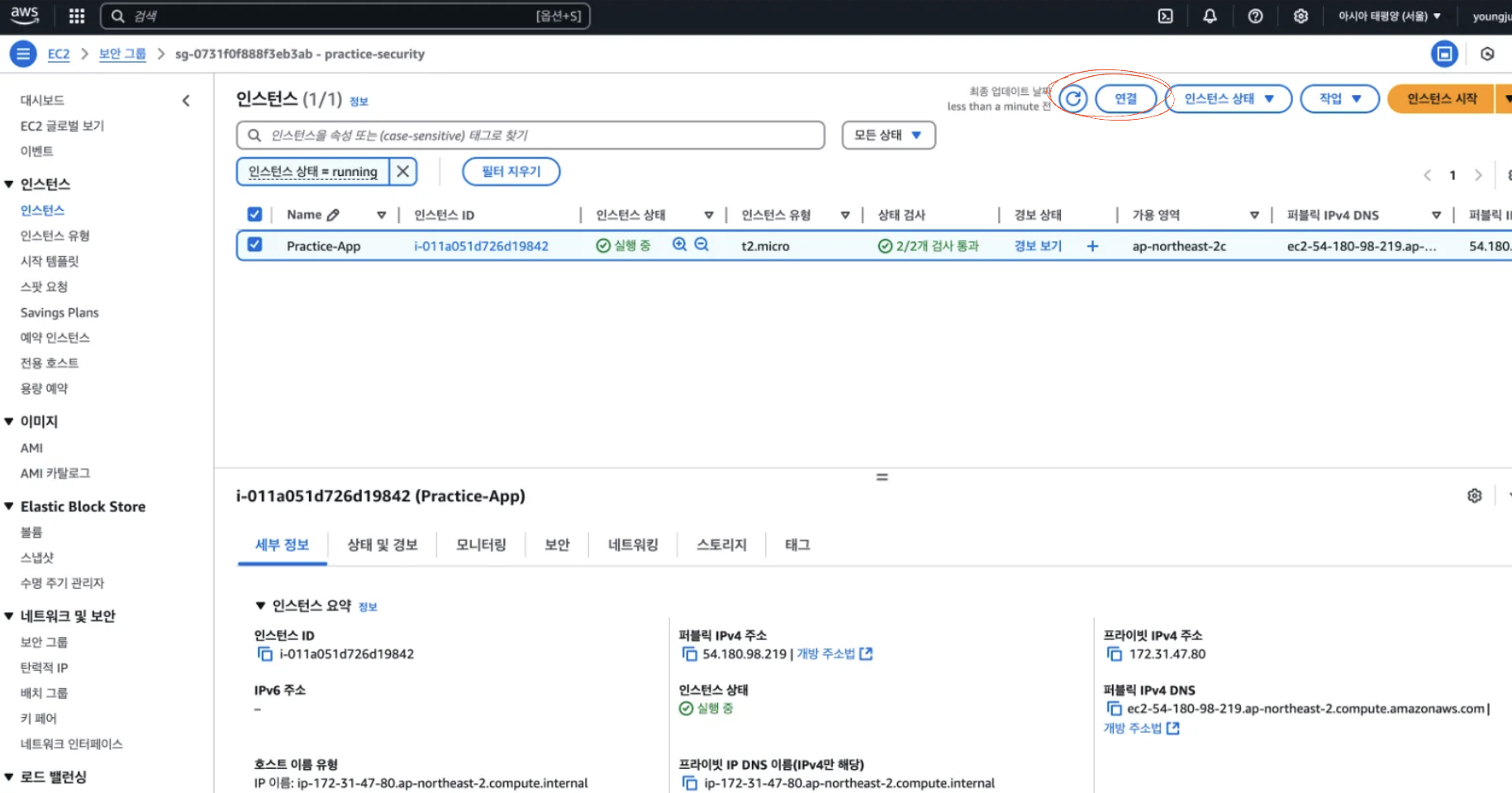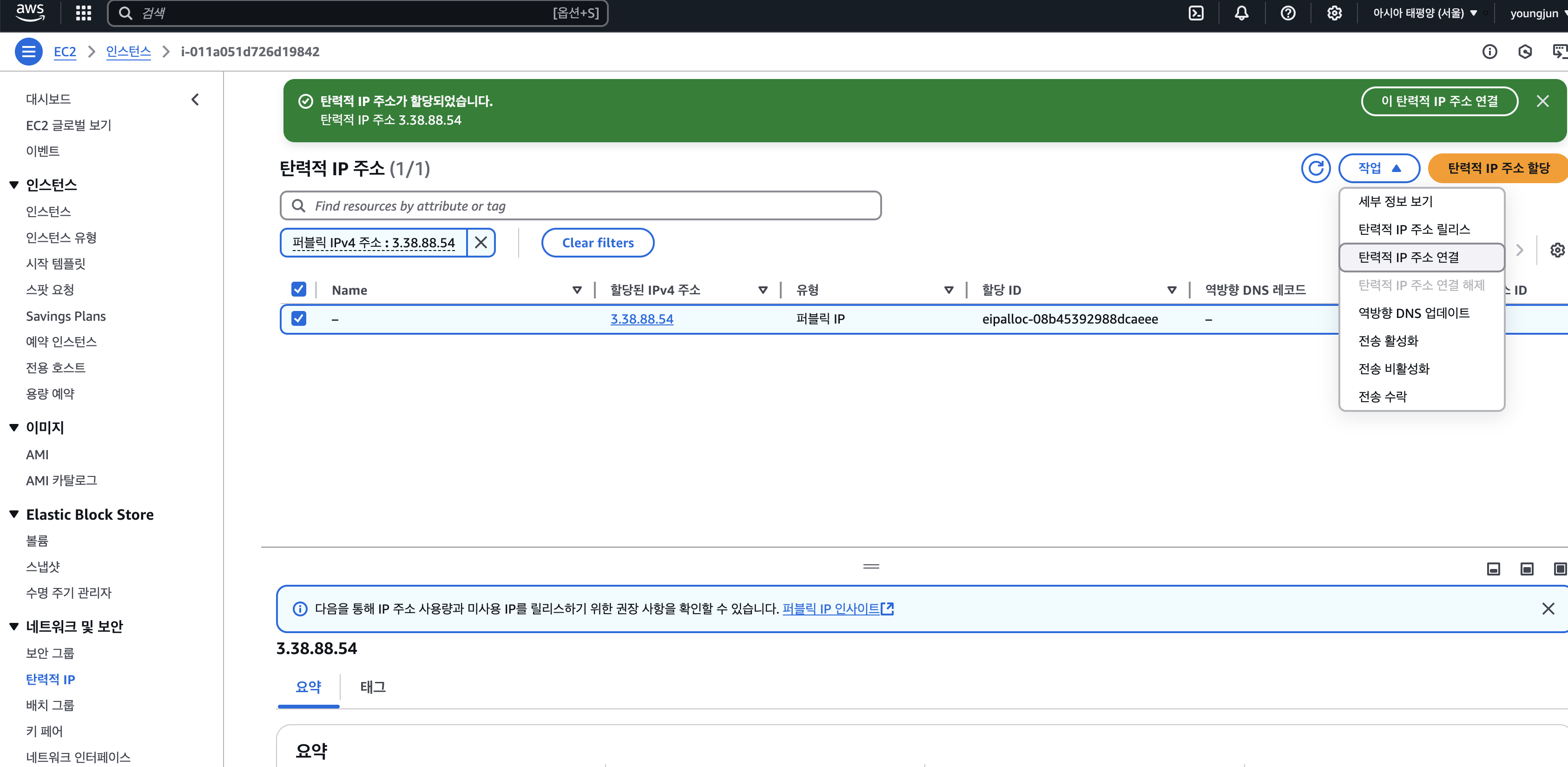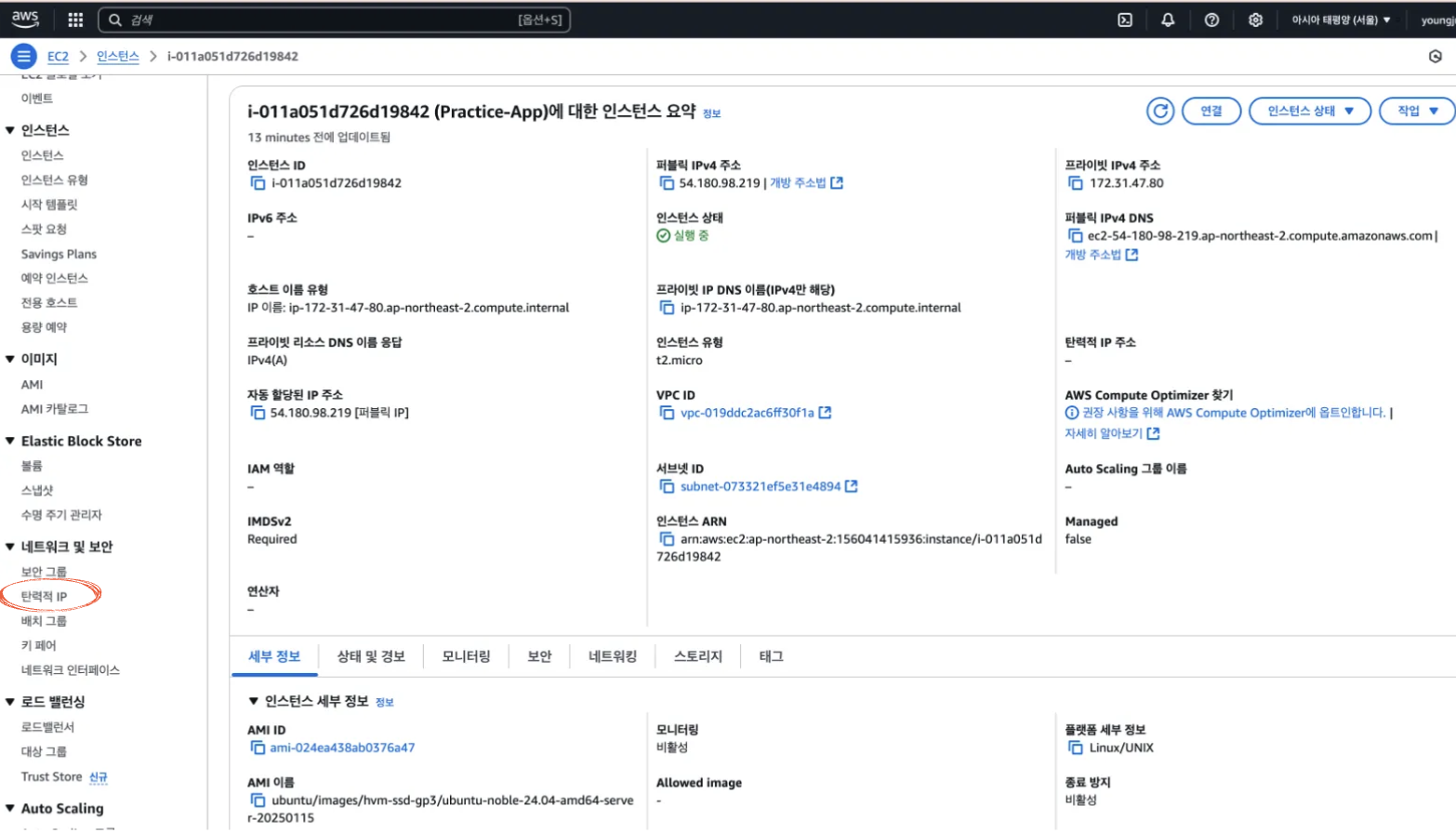 최종적으로 다시 EC2를 확인하면 탄력적 IP주소가 생성되었고 공용 IP 주소 또한 탄력적 IP 주소로 바뀐 것을 확인할 수 있습니다.