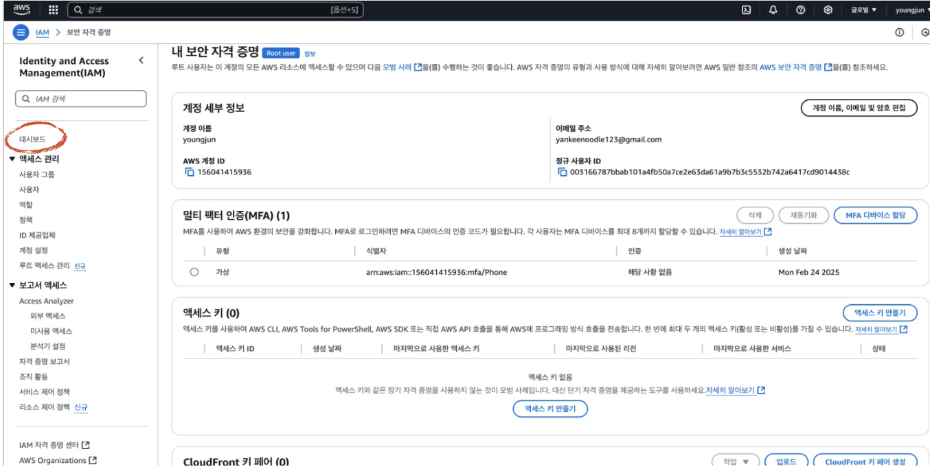 - 우선 AWS로 로그인 한 후, 오른쪽 위 메뉴바에서 이름을 누르고 > 보안 자격 증명으로 들어가주세요.
