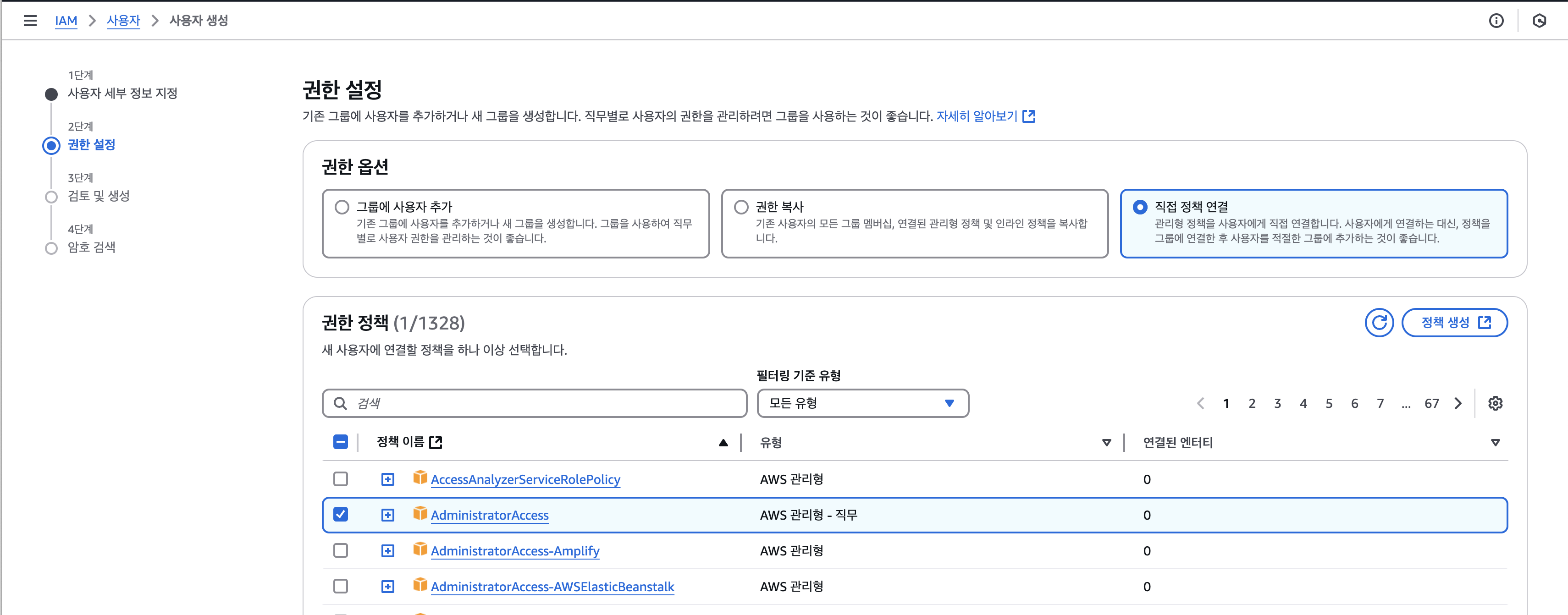 - 직접 정책 연결에서 AdministratorAccess( 빌링을 제외한 모든 권한)을 준 상태에서 다음으로 넘어가겠습니다.