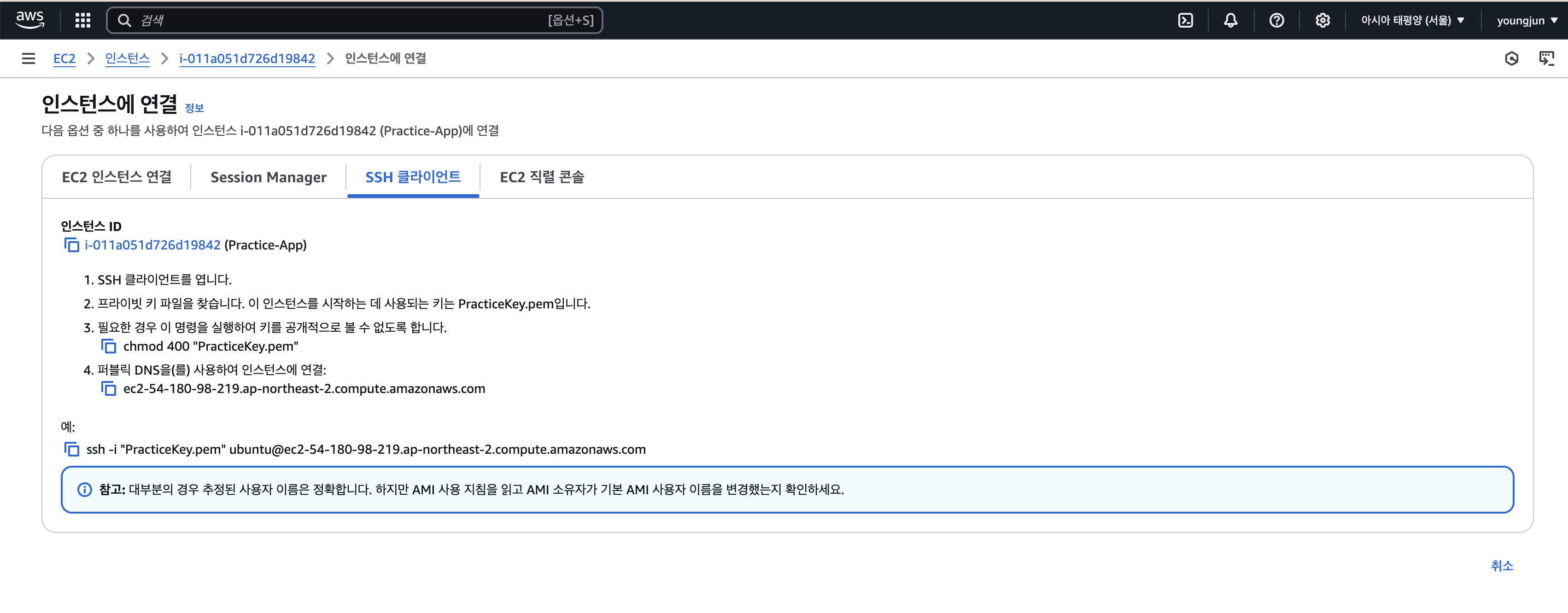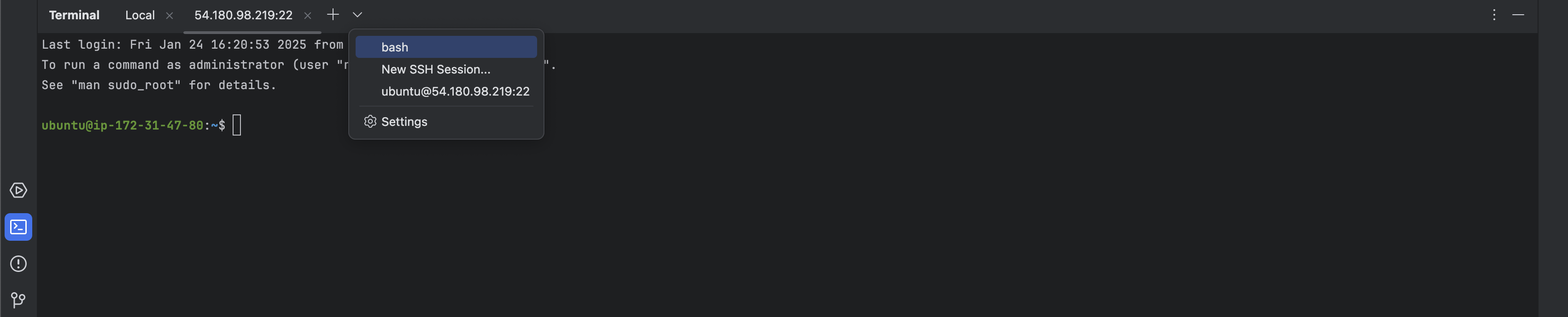 언제든지 아래 토글을 누르고 ubuntu를 클릭하시면 Ec2로 연결되는 터미널을 열 수 있습니다.