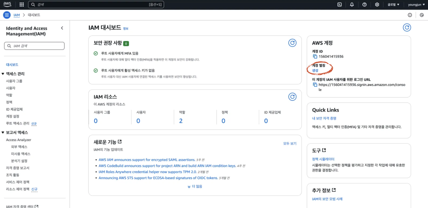 - 계정 별칭을 생성해 주도록 하겠습니다. 별칭을 만들어 놓으면 나중에 계정 ID가 아닌 별칭으로 로그인이 가능합니다! ( 계정 ID 숫자를 이용해서 로그인 한다고 생각하면 불편하겠죠..?)