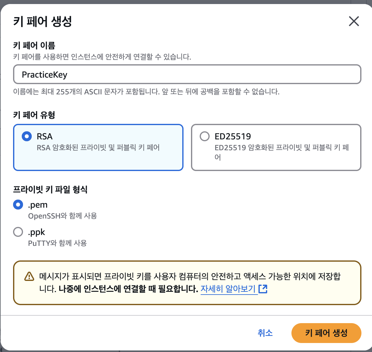 - 키페어 : 다음과 같이 이름은 자유롭게 생성해서 보관해 주시면 되겠습니다. (열쇠 같은 용도로 쓰이니 잊어버리면 안 됨)