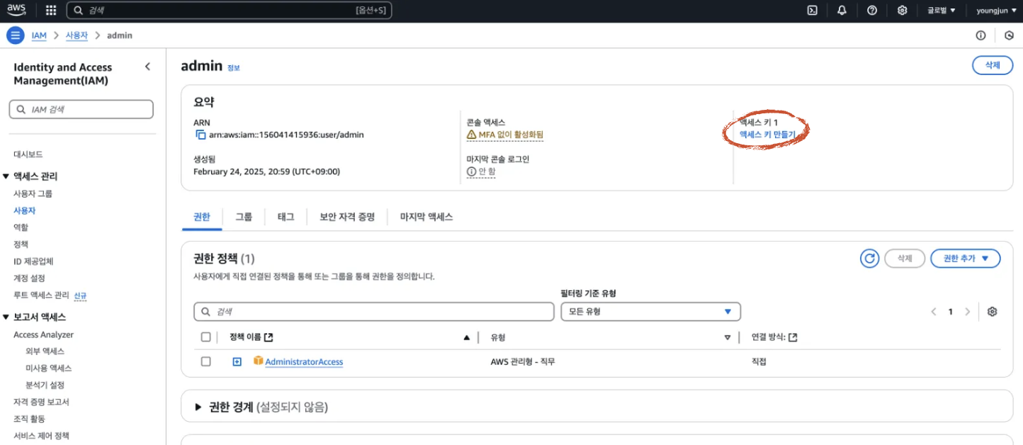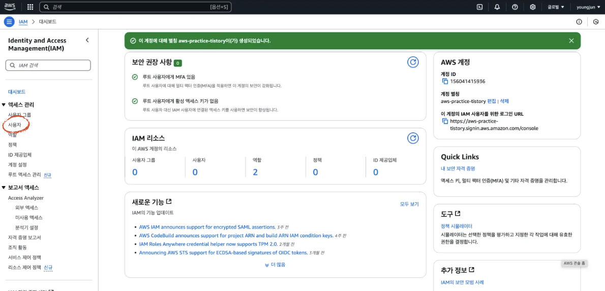 - 성공적으로 생성이 완료되었습니다. AWS API AccessKey가 필요하다면 추가적으로 만들수도 있지만 우선 넘어가겠습니다!