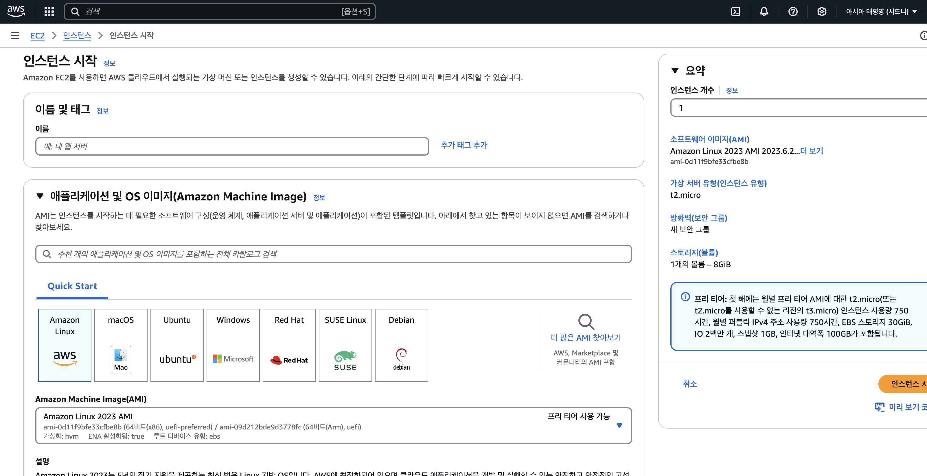 - t2.micro 등 프리 티어에 포함된 인스턴스 유형을 선택하세요.