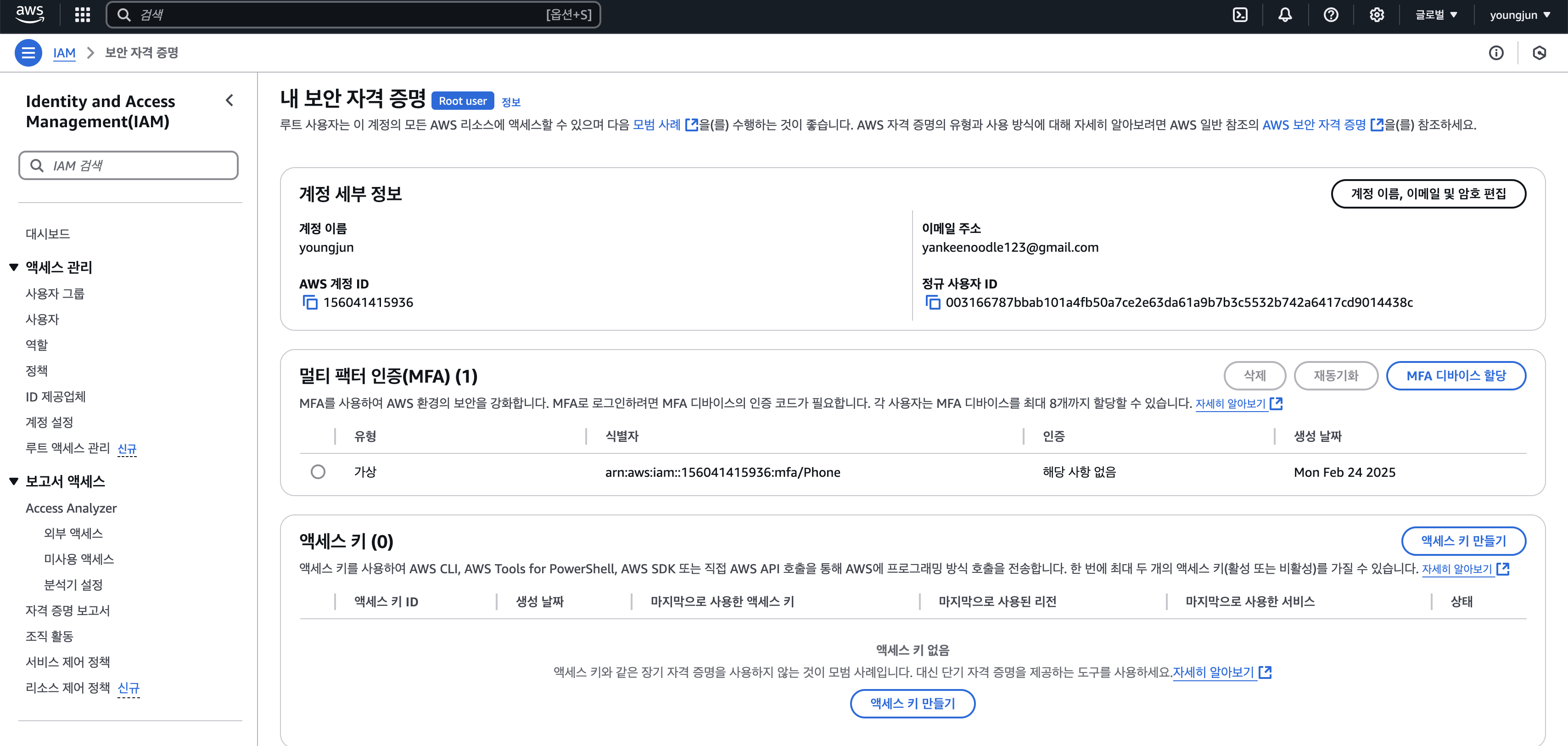 - 들어오셔서 루트 계정에 해주었던 MFA 등록을 똑같이 해주세요! (생략) 앞으로는 Root 계정이 아닌 IAM 계정을 사용하겠습니다.