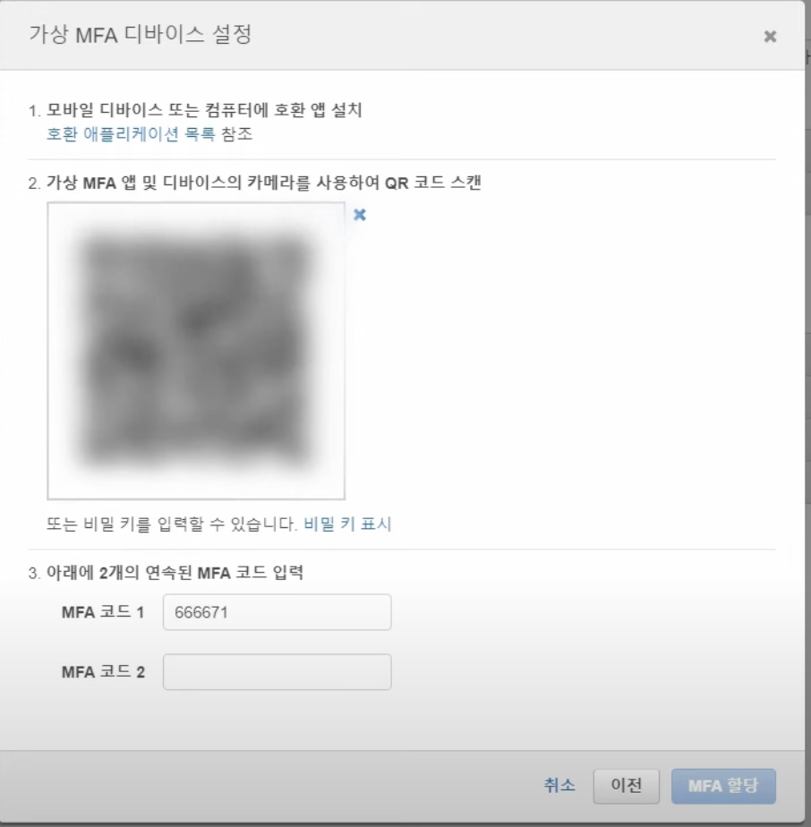 - QR은 컴퓨터에 다른 이름으로 저장해 두시는 것을 추천합니다. 핸드폰을 잃어버리면 AWS에 접속할 수 없고 복구하기도 정말 힘들거든요...