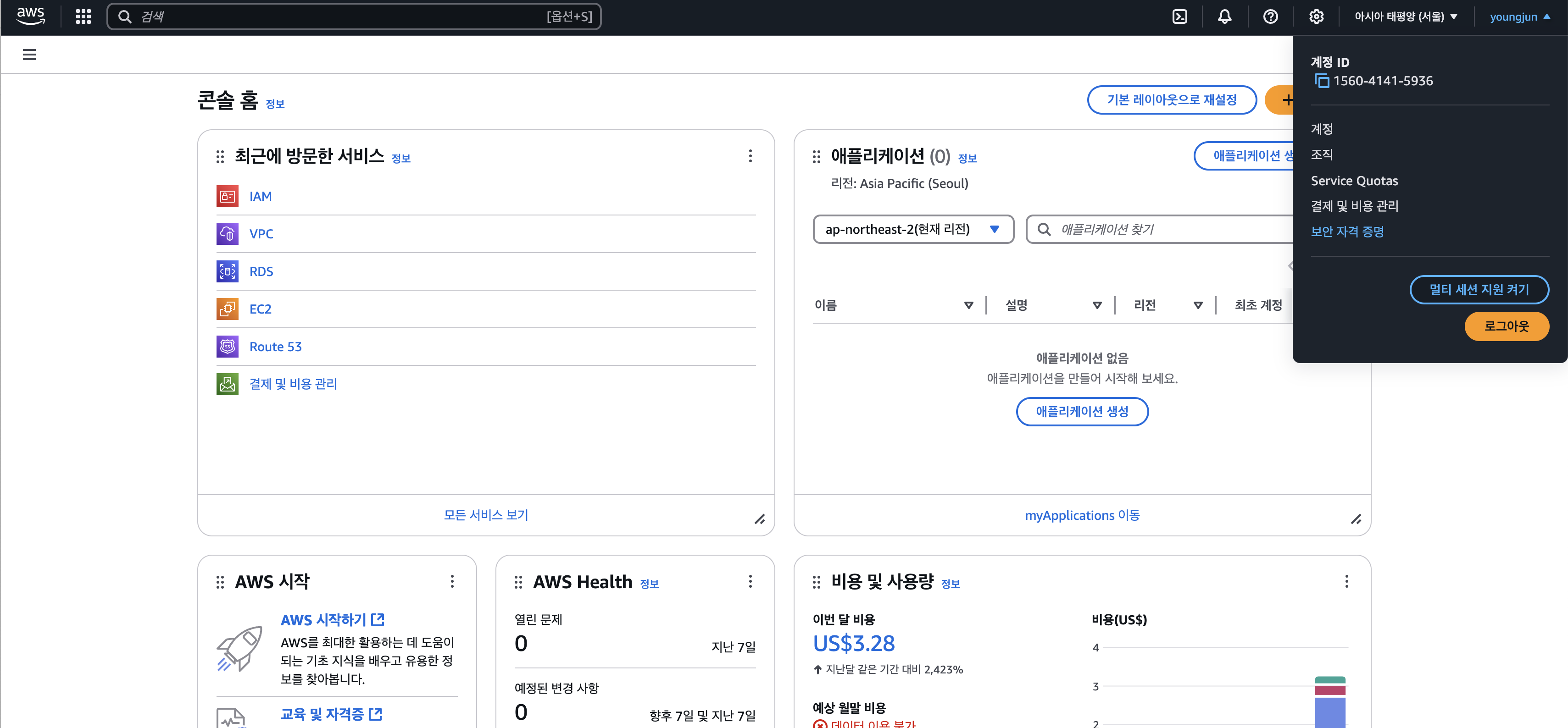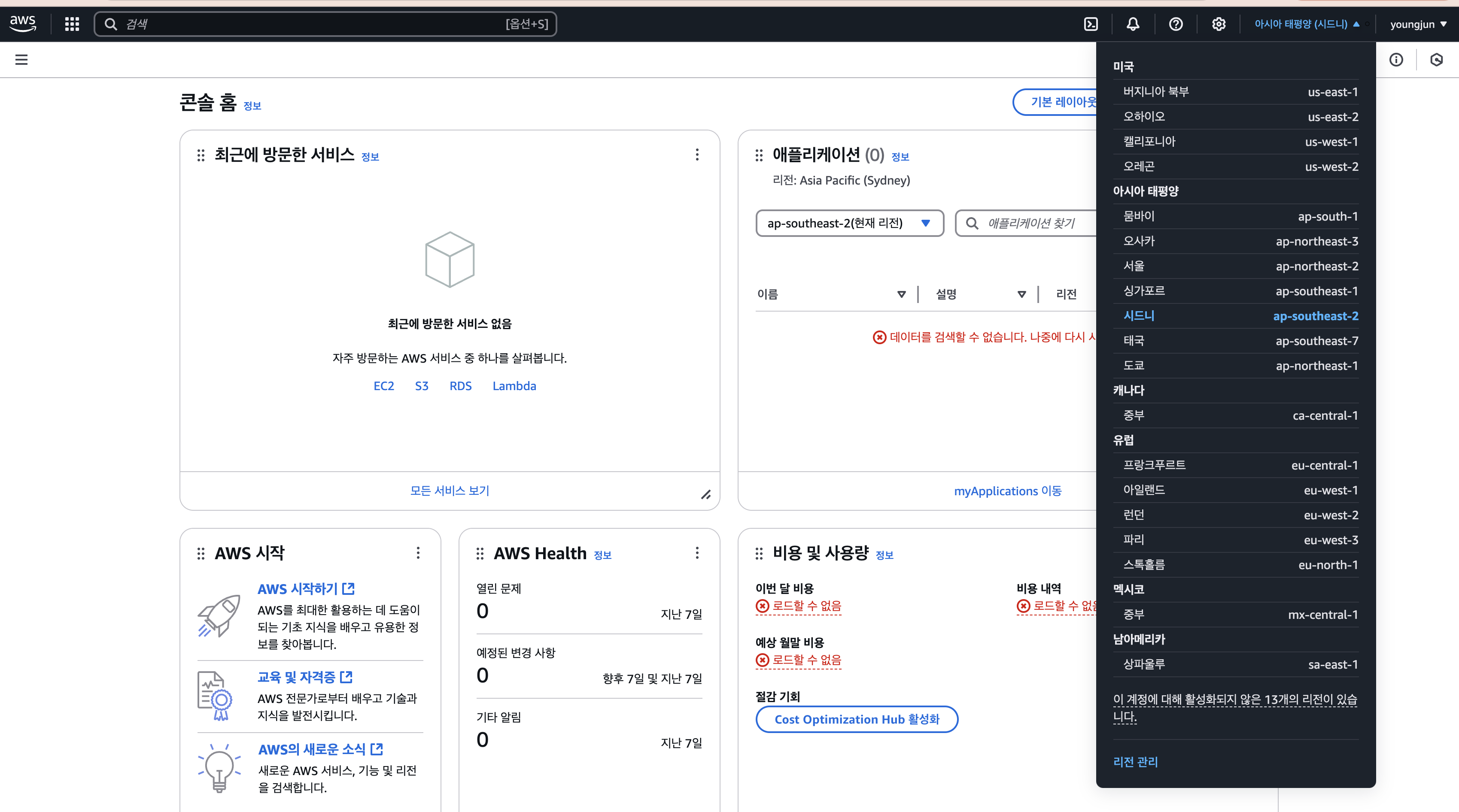 AWS에 들어오게 되면 다음과 같은 메인 화면이 있는데 사진의 메뉴바가 리전입니다. 일반적인 경우 서울을 사용하시면 됩니다!