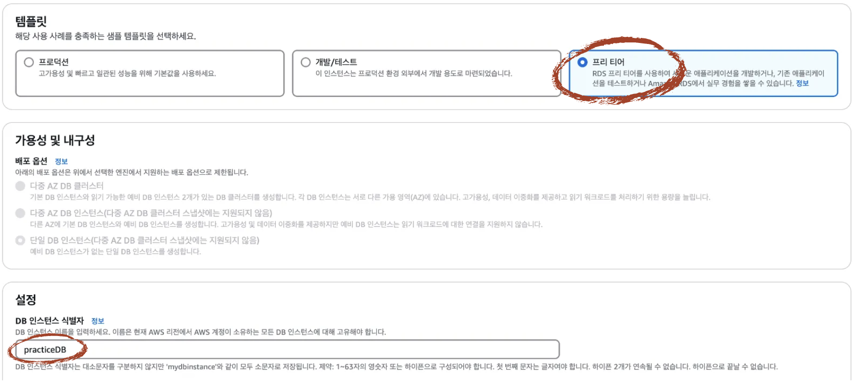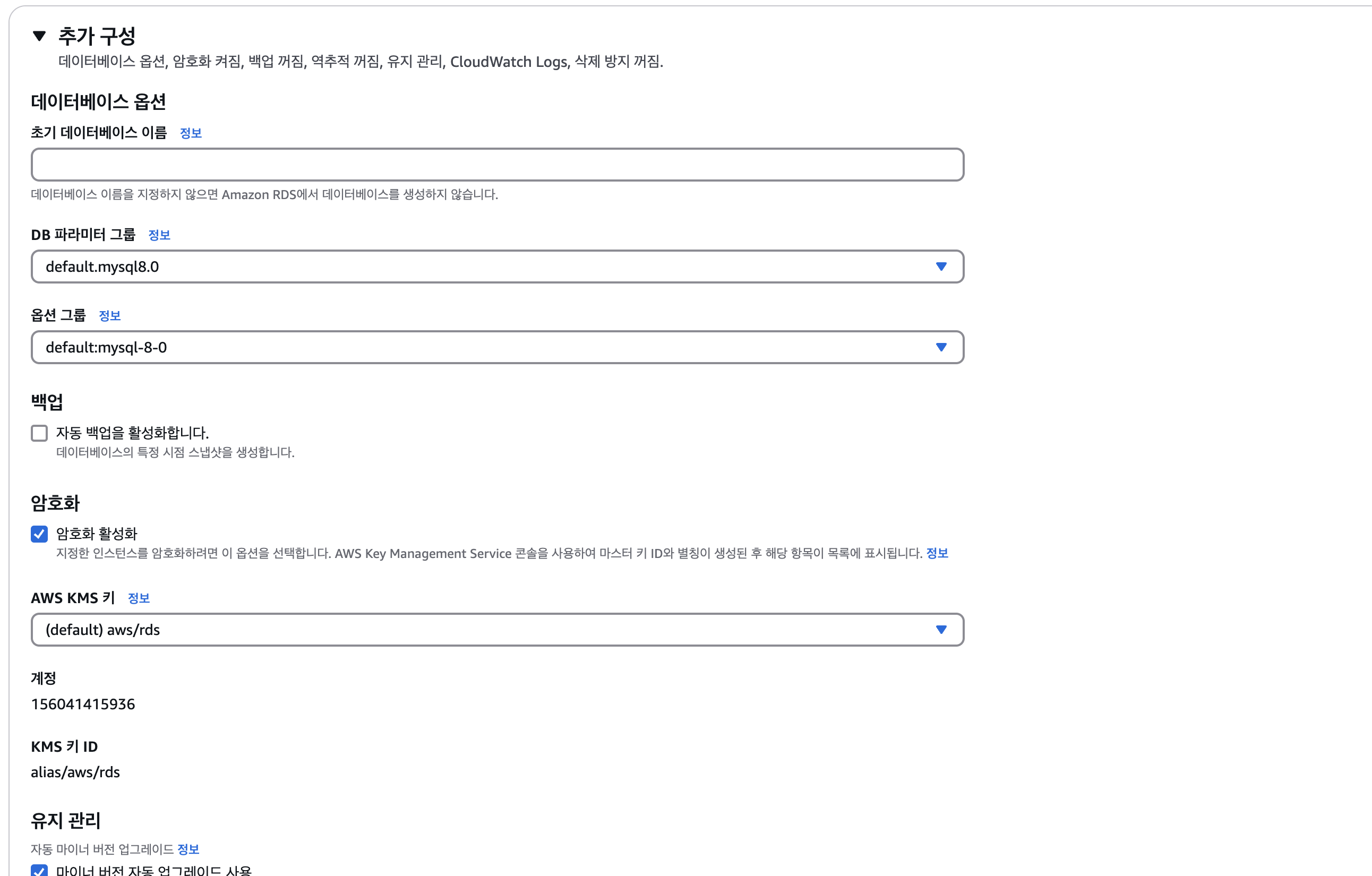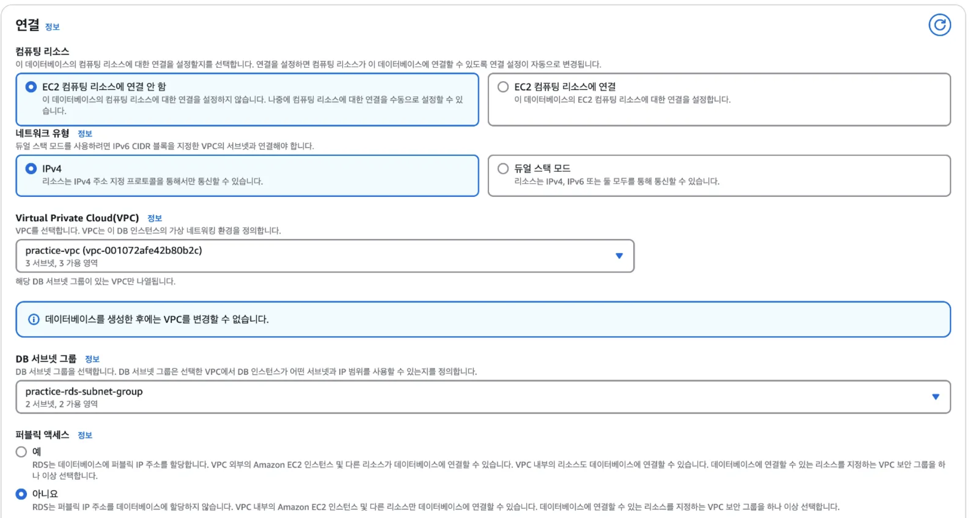 - DB 서브넷 그룹은 아까 만들었던 서브넷 그룹을 선택해주시고 퍼블릭 엑세스는 아니오를 선택해주세요.