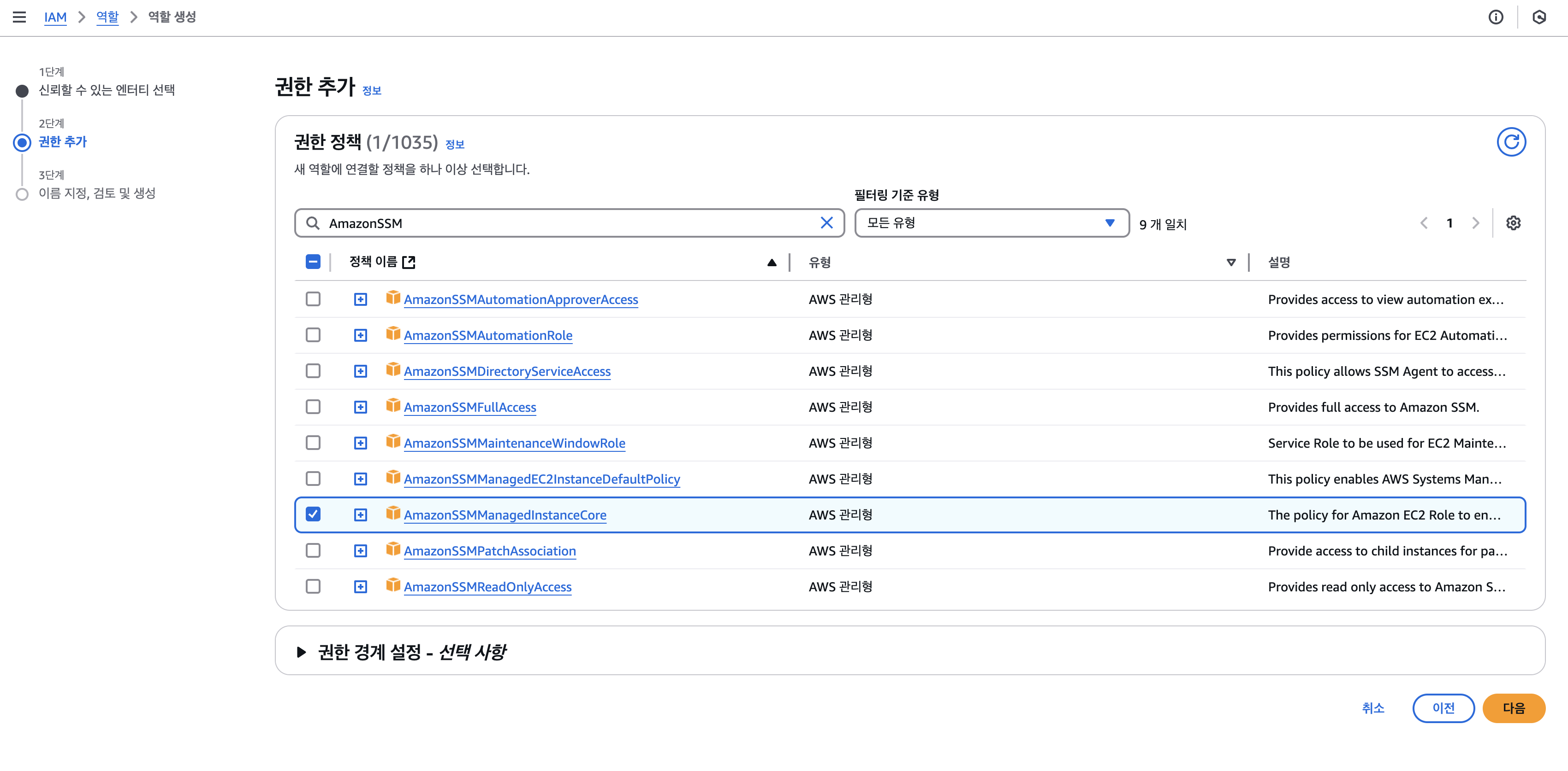- AmazonSSMMangedInstanceCore 권한을 추가해주세요.