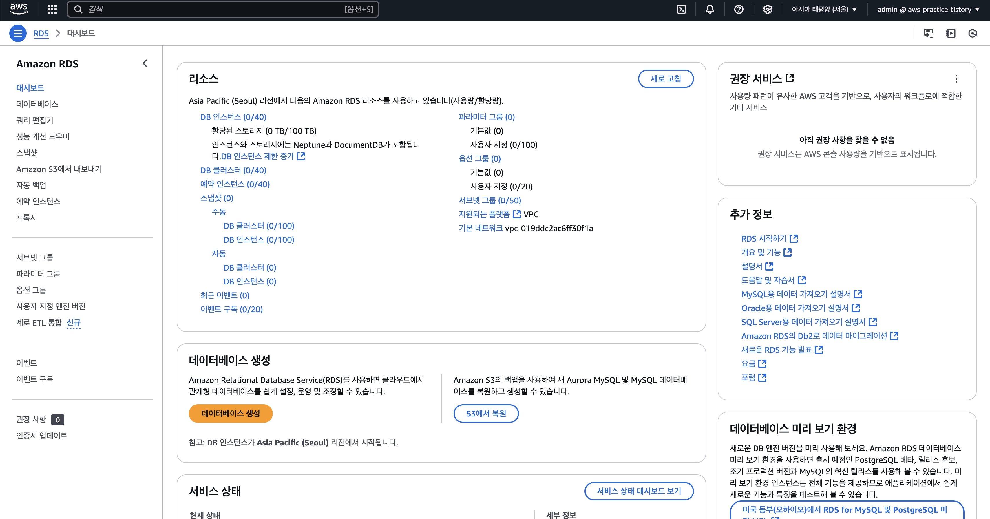 - 이제 RDS를 만들기 위한 준비를 해보겠습니다. AWS 검색창에 RDS를 검색하고 들어가 주세요.