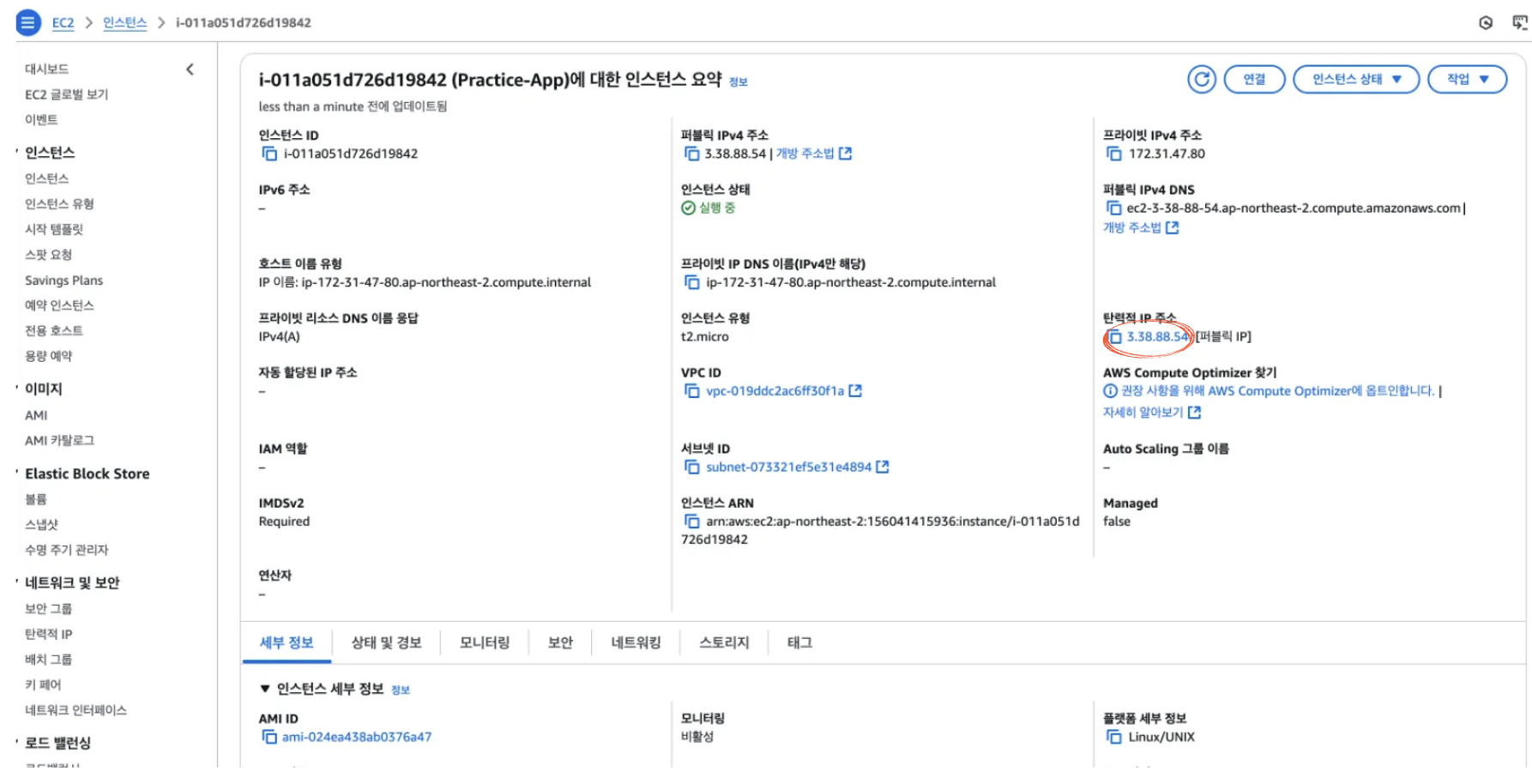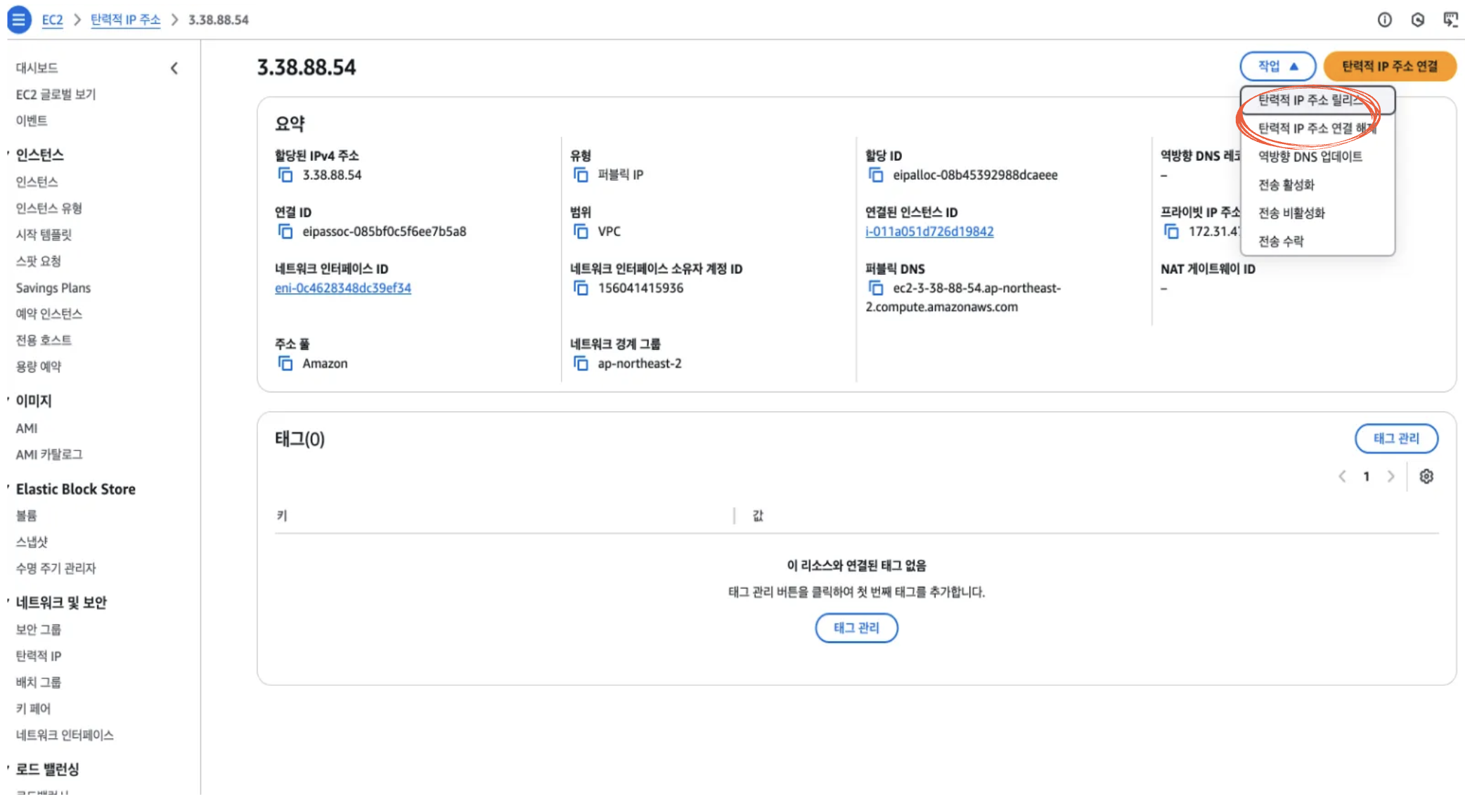 - 탄력적 IP 주소 연결해제 후 IP 주소 릴리즈를 해주시면 됩니다.