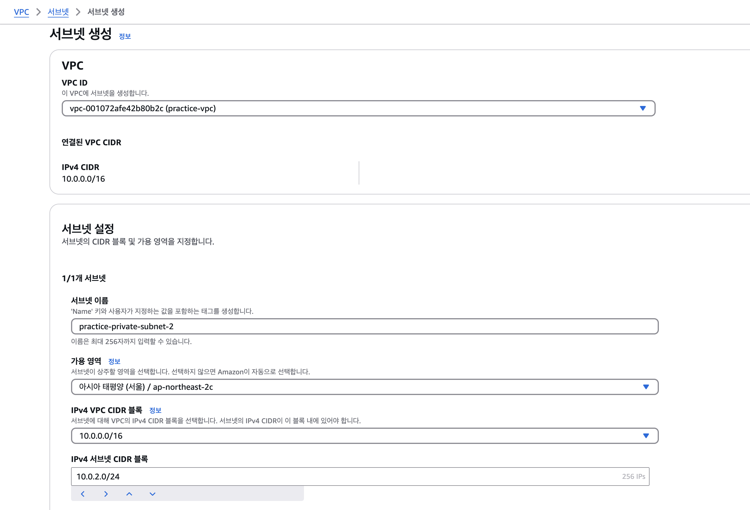 - 서브넷 이름은 자유롭게 선택해주시고, 사용하지 않았던 CIDR 서브넷과 가용영역을 선택해주세요.