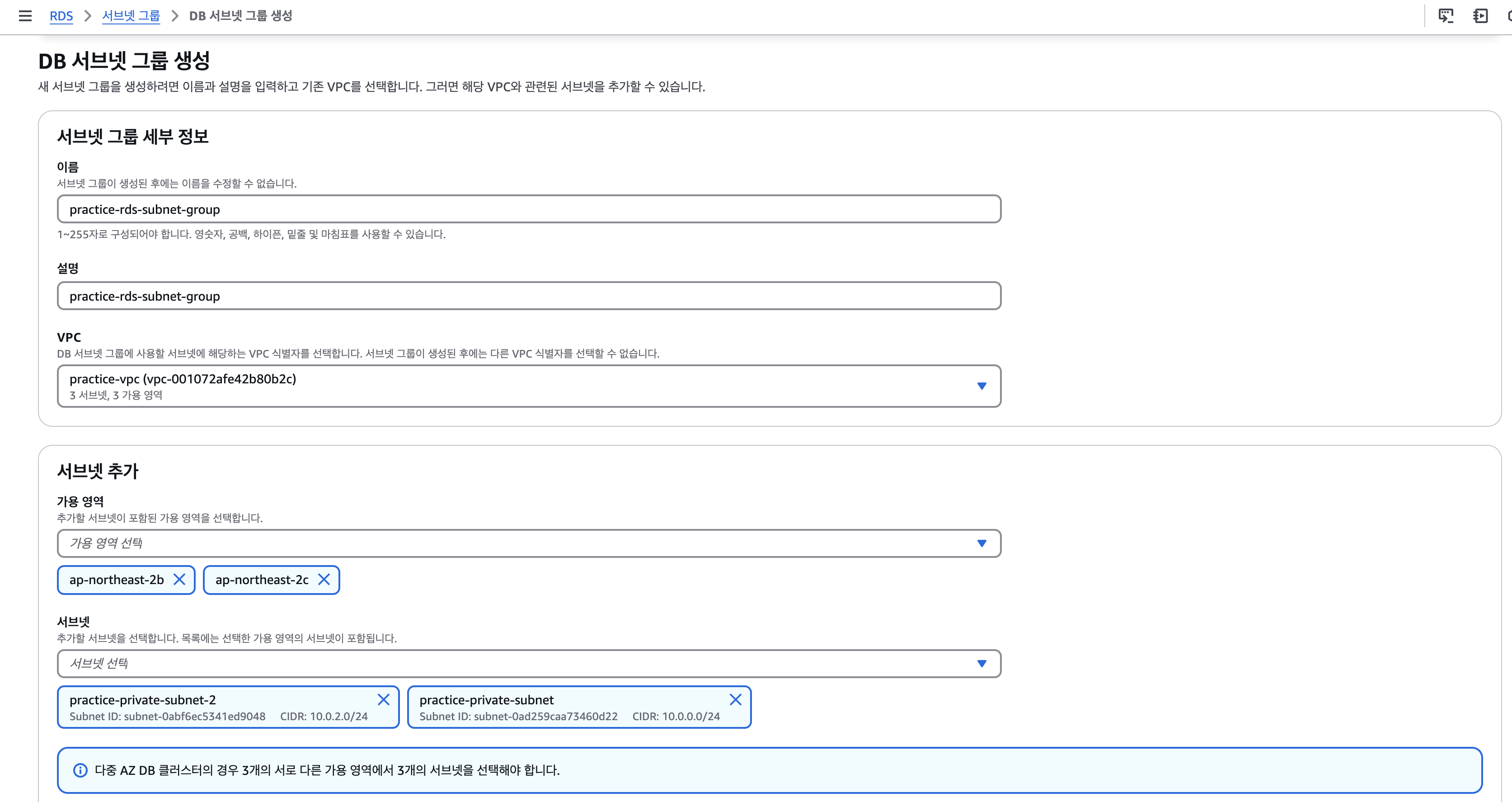 - 보안 그룹은 기존에 만들어 놓았던 RDS용 보안그룹은 선택하고 가용 영역은 private VPC 둘 중 하나의 가용 영역을 선택해줍시다.