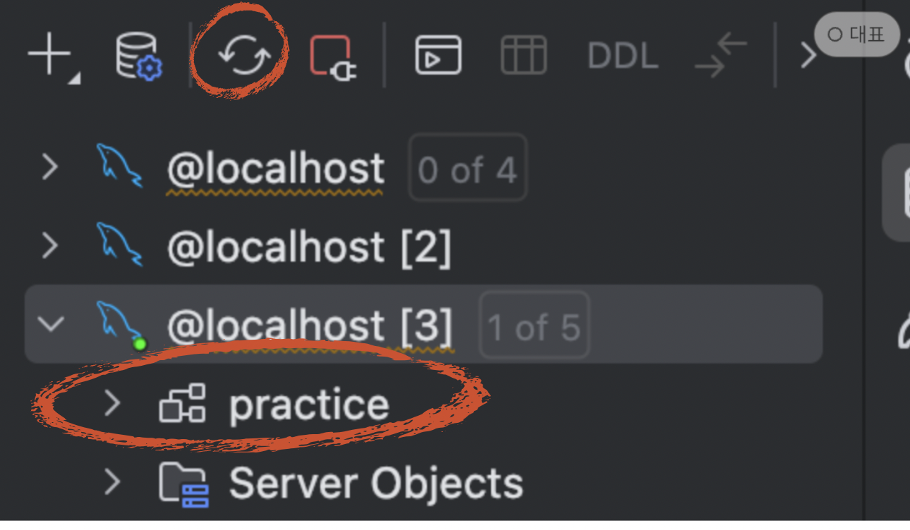 - practice 데이터 베이스 스키마가 생겼습니다! 보이지 않는다면 위의 리프레시를 해주지 않았기 때문입니다.