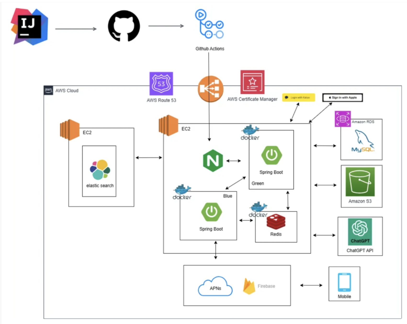 - Nginx와 Docker를 이용해서 Blue-Green 무중단 배포를 구현했고 Github Action을 통한 CI/CD로 이를 자동화했습니다.
