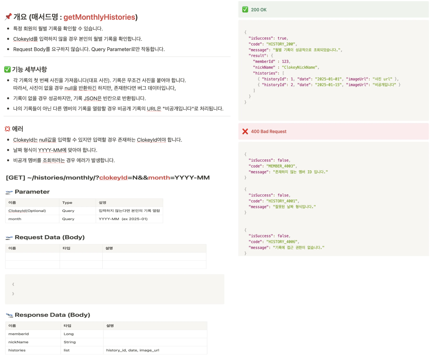 다음과 같은 템플릿을 사용하여 API 명세서를 정리했습니다. 프론트에게도 구체적인 정보를 제공하지만 백엔드 팀원들끼리도 서로 기능을 이해하고 코드 리뷰를 할 때 코드를 이해하기 조금 더 쉬웠던 것 같습니다.