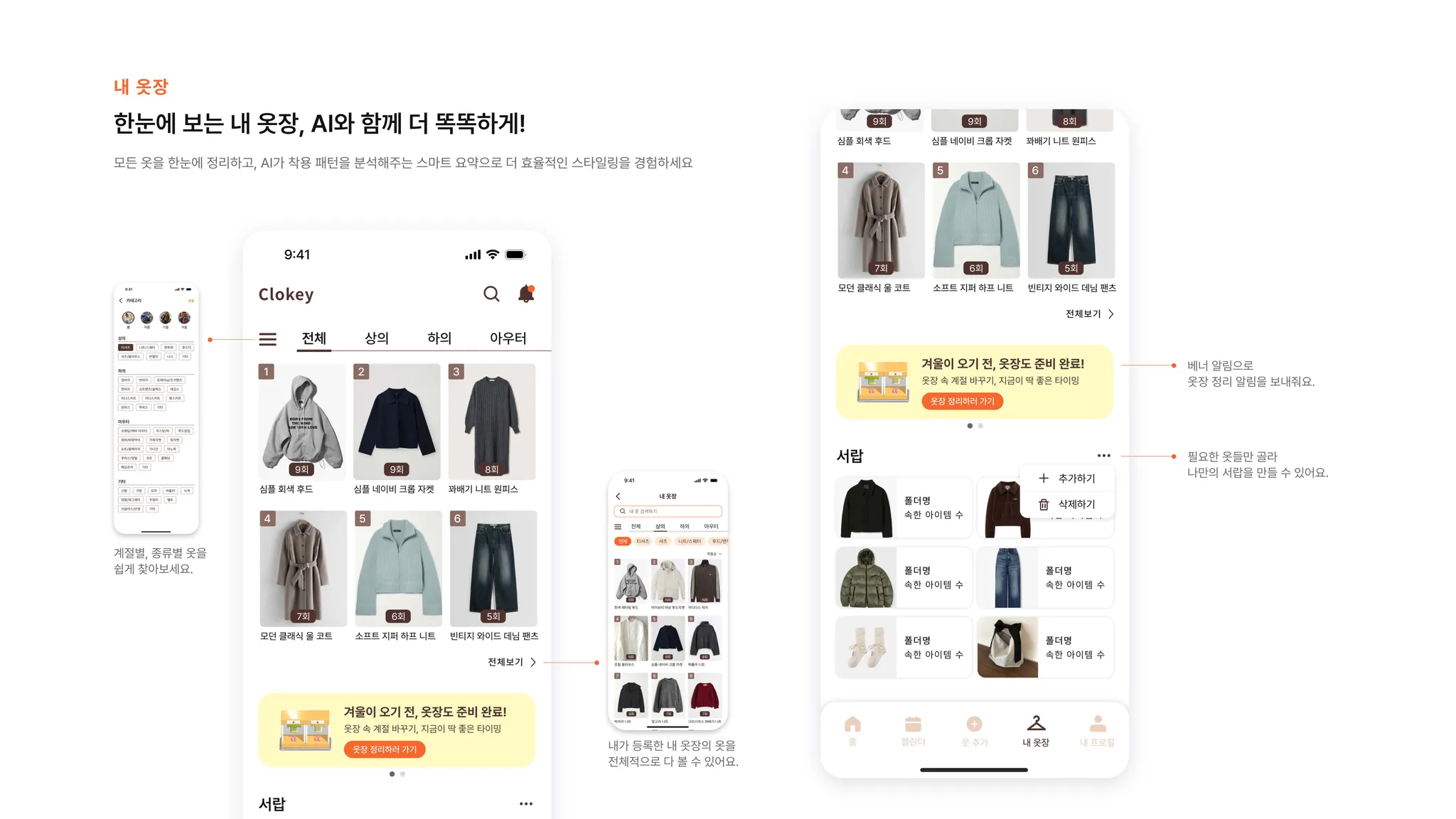 Clokey는 당신의 옷장을 스마트하게 정리하고, 실시간 날씨에 따라 옷을 추천받으며, 다른 사용자들과 스타일을 공유할 수 있는 패션 기록 앱입니다. Clokey는 옷장의 디지털화를 통해 보유한 옷을 한눈에 파악하고, 착용 기록을 바탕으로 패션 소비 패턴을 가시적으로 확인할 수 있도록 도와줍니다.