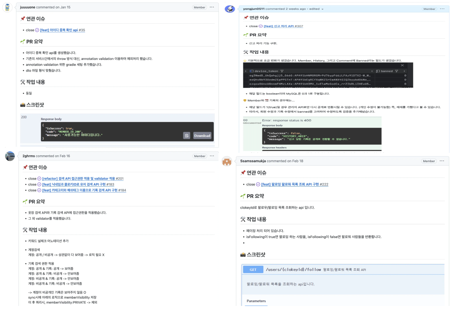 또한, 개발자로서 가장 중요한 역량 중 하나인 협업의 중요성을 크게 깨달았습니다. 백엔드 개발자들 간의 소통뿐만 아니라, 다른 파트와 원활하게 협력하는 방법, 그리고 고려해야 할 요소들에 대해 깊이 고민할 수 있었습니다.
