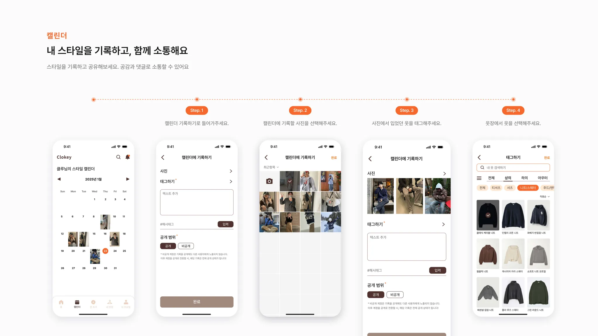 매일의 코디를 기록하고 ‘출근룩’, ‘데이트룩’ 같은 태그로 저장하면, 나만의 스타일 히스토리가 완성됩니다. 과거 코디를 보며 비슷한 상황에서 참고할 수 있어요.