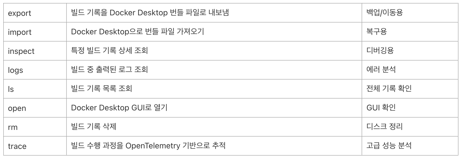 Build 기록(Record)을 관리하거나 조회하는 명령어 그룹입니다. 빌드를 실행할 때마다 BuildKit은 "빌드 레코드"를 남기는데 이것을 조회, 삭제, 내보내기(export) 하는 용도로 사용합니다.