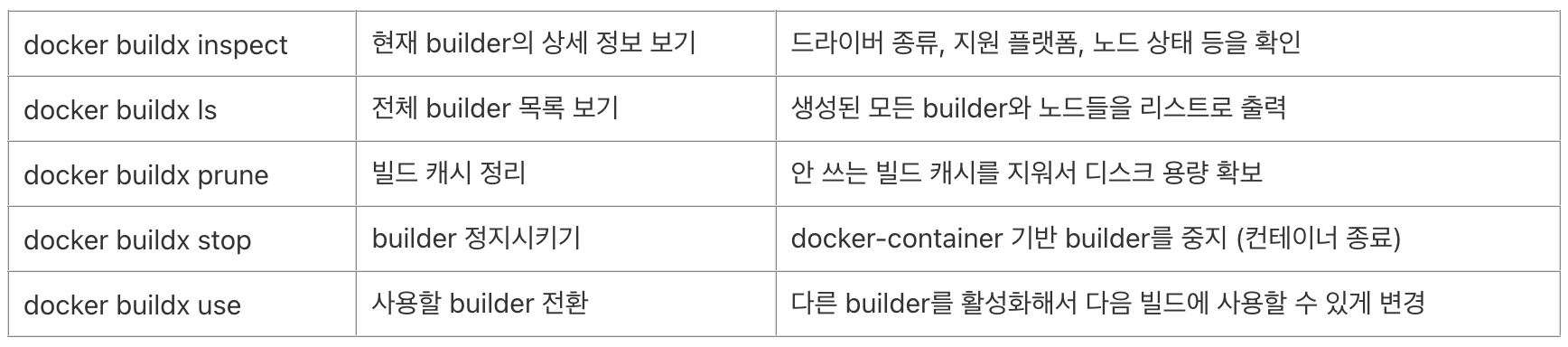 - 멀티 플렛폼을 빌드하기 위해서는 buildx create를 통해서 builder를 만들어 주어야 합니다.
