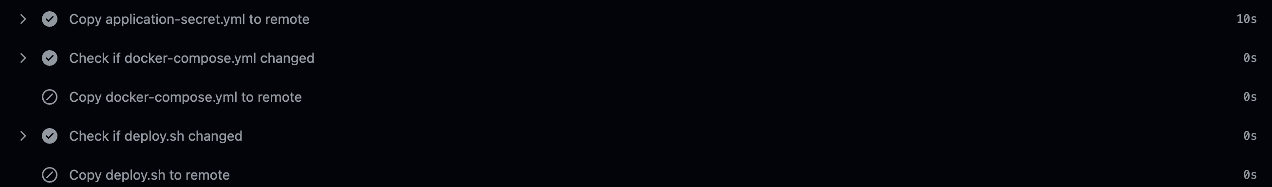 마지막으로, 생각보다 EC2로 파일을 전송하는 행위 자체가 오래 걸리는 것 같아서 git으로 관리되는 해시값을 비교해서 수정되는 경우에만 전송하도록 수정했습니다 (application-secret.yml)은 gitignore 되어 있어서 불가능.