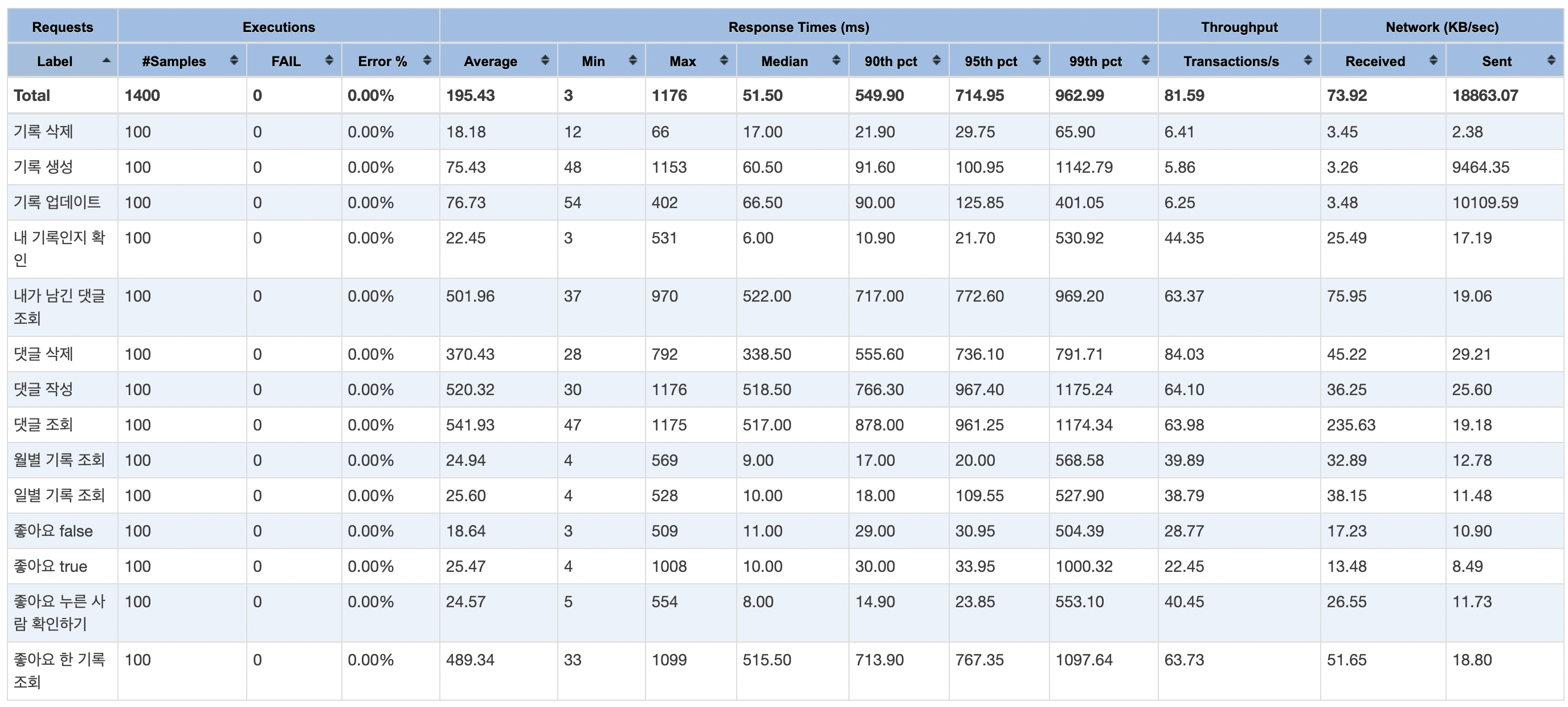 Result Tree로 확인한 결과 첫 번째 실행 이후에 급격하게 줄어들게 되며 이 부분은 나중에 로그를 찍어서 확인해 본 결과도 동일했기 때문에 JVM이 warm-up 하는데 걸리는 소모값이라고 생각했습니다. 그리고 지속적으로 줄어들게 되는데 이는 MySQL innoDB에서 인메모리 캐싱이 일어날 수 있다고 판단했습니다. 결론적으로, 제가 깨달은 점은 Jmeter 같은 부하 테스트 도구는 이런 레포지토리의 한 매서드 단위를 테스트 하는 것에 사용하는 것은 적합하지 못하다는 점입니다. 부하 테스트 도구를 사용할 경우 자세한 로그 같은 정보를 확인할 수 없으며, 완성된 API 하나를 기준으로 실제 상황과 비슷한 다양한 입력값과 여러 이용자를 가정한 실험을 하면서 부하량에 대한 테스트를 수행하기 적합한 것이지, 지금과 같이 배우기 위한 실습 용도로도 Repository의 매서드 하나하나를 테스트하는 용도로는 부적합했습니다.