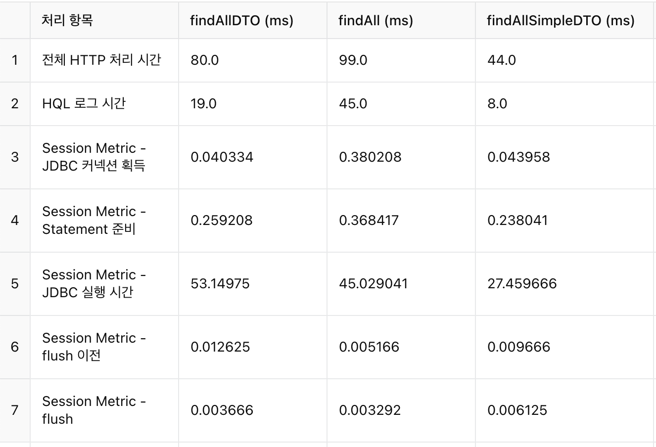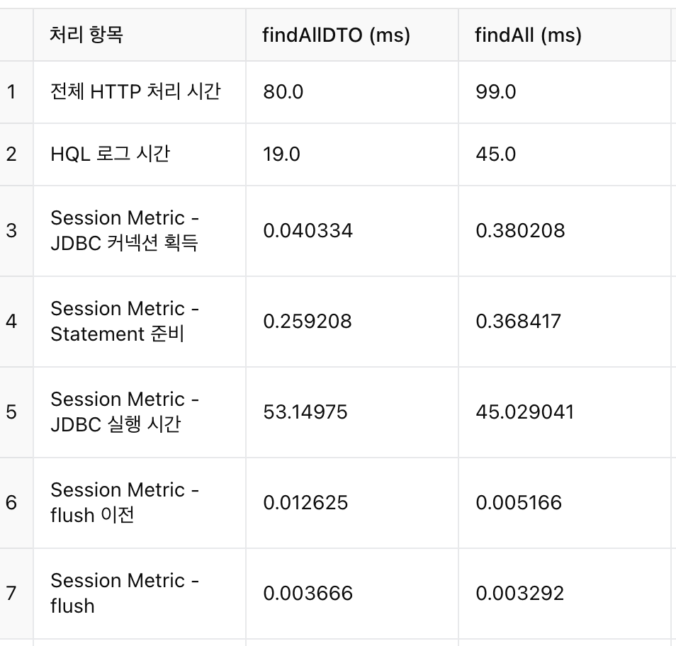 지금까지는 모든 열을 함께 반환하는 DTO로 비교했는데 이번에는 2개의 열만 반환하는 예시도 함께 결과를 첨부하겠습니다.