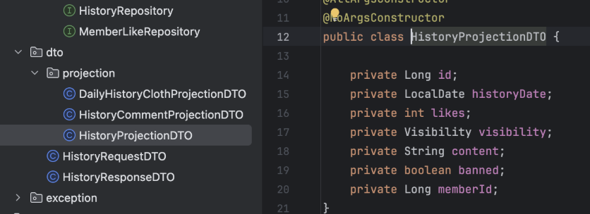 다음과 같이 엔티티의 필드를 모두 가지고 있는 Projection용 DTO를 하나만 만들어 놓았고.