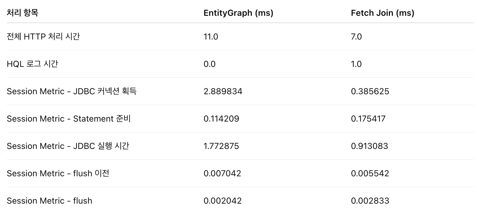 큰 차이가 나지 않지만, Fetch Join이 살짝 더 빠른 결과가 나왔습니다 (실행마다 조금씩 다름). 어떤 것을 선택해도 성능에 큰 차이가 나지 않을 것으로 생각됩니다.
