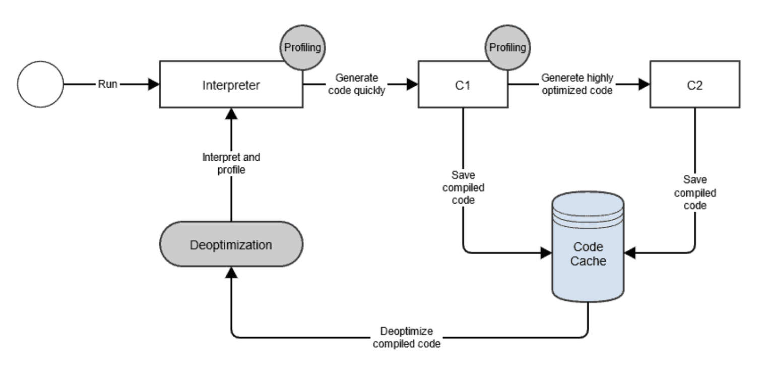 처음 시작할 때는 기본적으로 모든 바이트 코드를 인터프리터로 실행하며 프로파일링 정보(얼마나 호출되는지, 얼마나 반복되는지 등)을 수집합니다. 이 정보를 바탕으로 자주 호출되는 HotSpot을 찾게 되며 초기에는 C1으로 컴파일해 가지고 있다가 지속적으로 재호출이 되게 된다면 C2가 재컴파일하면서 더욱 최적화된 컴파일을 수행하게 됩니다. 반대로 호출이 점점 더 적게 된다면, 역으로 인터프리터로 실행되도록 deoptimize 할 수도 있습니다.