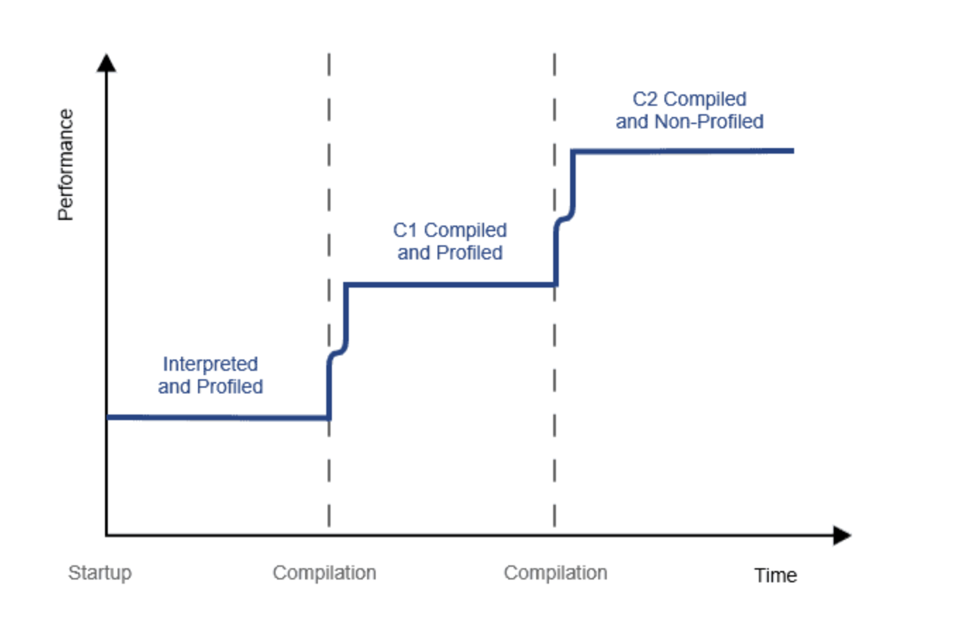 이런 단점을 보완하고자 JVM은 JIT Tiered Compliers를 사용합니다. 간단히 개념을 설명하자면