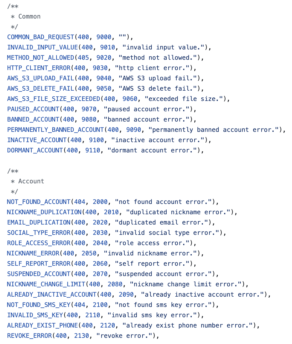 Account와 관련된 에러는 2000번대로 정해두고 10씩 올라가는 코드를 사용하는 것을 확인할 수 있습니다.