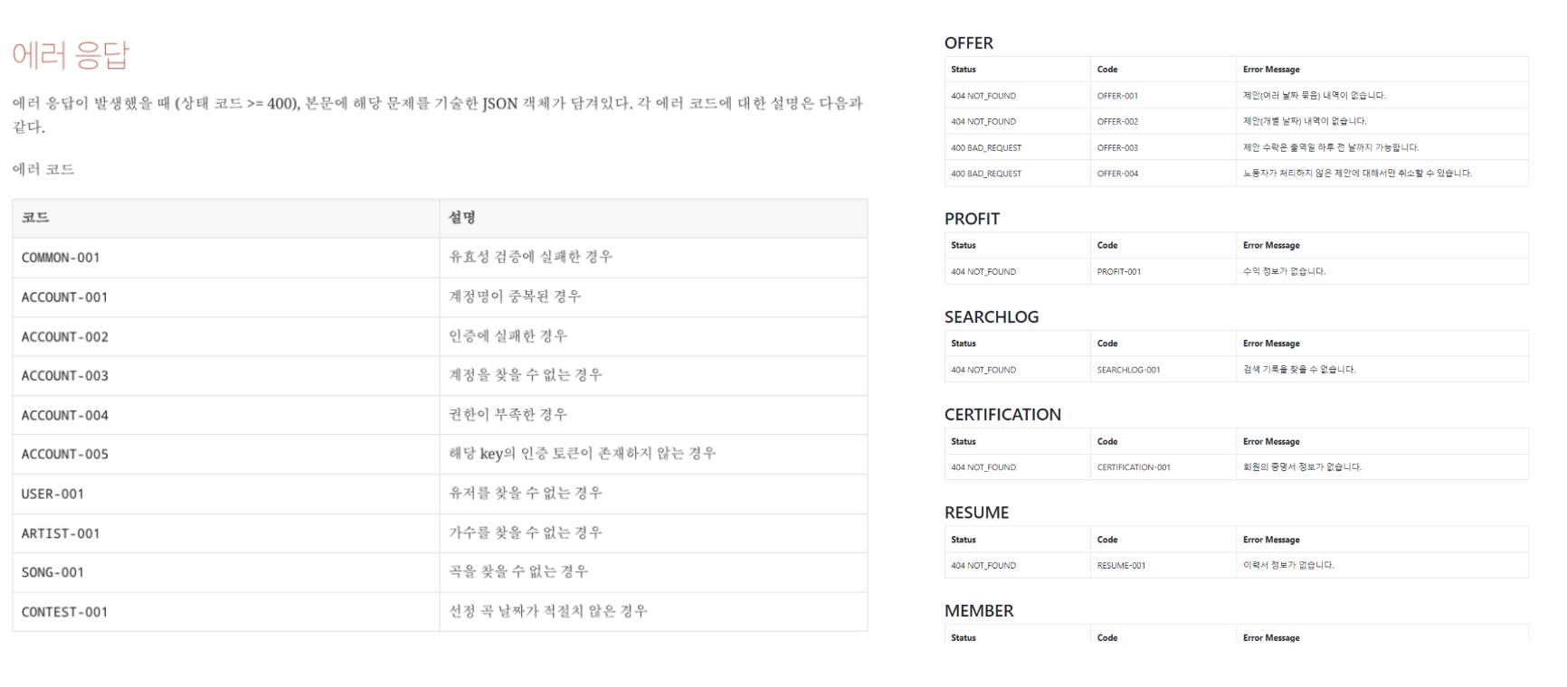 이 예시에서는 COMMOM과 ACCOUNT등 어디에서 발생하는 에러인지 표시하는 것은 동일하나 001부터 시작해서 올라가는 것을 확인할 수 있습니다. 역시 알아보기 쉬운 커스텀 에러 코드입니다.