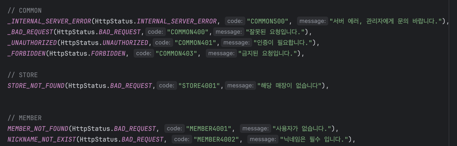 커스텀 상태 코드를 공부하면서 대부분의 커스텀 상태 코드의 경우에는 400번대 에러에 관한 상태 코드 예시를 많이 보았습니다. 이번 스터디에서 배우게 된 것은 COMMON과 MEMBER 등을 붙이는 것은 동일하나 4001로 시작하게 만드는 방법입니다.